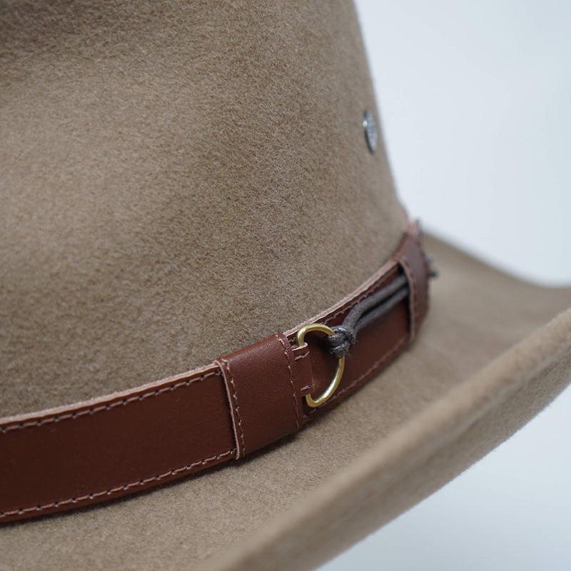 The crown has a distinctive shape with traditional indent on the dome and two deep dimples at the front of the crown creating a narrow point. The generous brim is wired so you can mould it to whatever shape you like. The inside is finished with a soft inner band for additional comfort. This hat is handmade from premium wool felt and is water repellent (ie. it will withstand normal rain, but we would advise against wearing it in very heavy rain where the felt could become saturated with water).