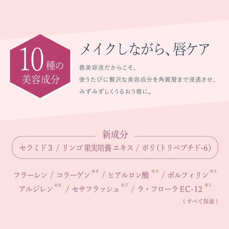 Fullerene, La Flora EC-12 *2, 3D Hyaluronic Acid *3, Cesaflash *4, Algilerine *5, Collagen *6, Bolphyline *7, Ceramide 3, Apple Fruit Cultivation Cell Extract, Poly (Tripeptide-6) (All moisturizing)
