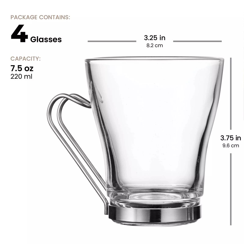 Bormioli Rocco Oslo Glass Cappuccino Cup With SS Handle 7.5Oz 4 Set Clear Silver