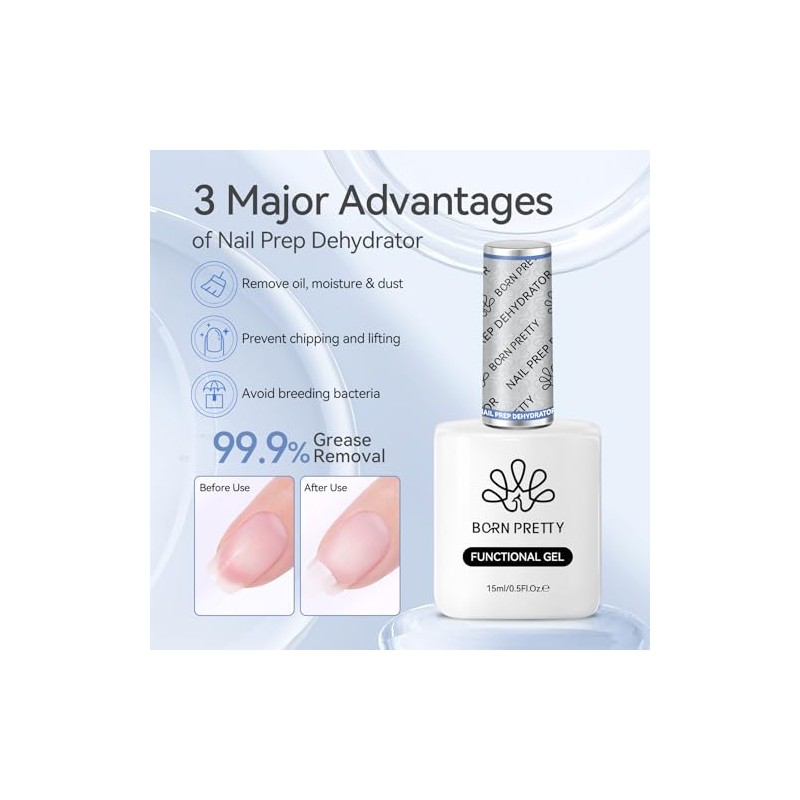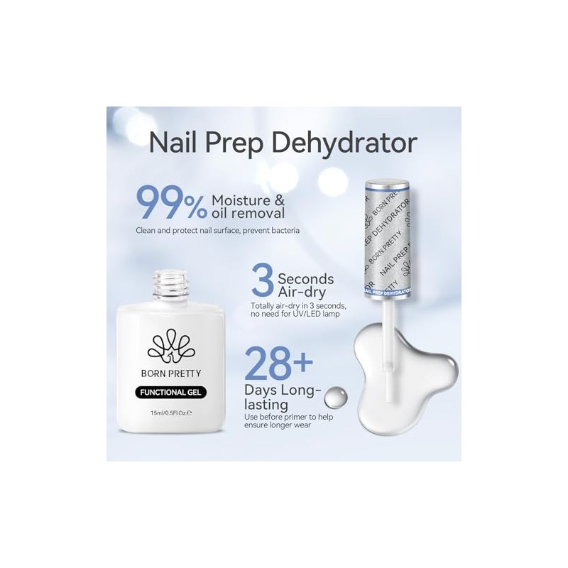 - PACKUNGSINHALT: 1 Flasche BORN PRETTY Dehydrator für Nägel 15 ml. Dieser professionelle Dehydrator für natürliche Nägel ist ein unverzichtbares Set für die Maniküre, um deren Haltbarkeit zu verbessern. Verwenden Sie dieses Set, um die beste Grundlage für Acrylnägel oder Gelnägel zu erhalten.