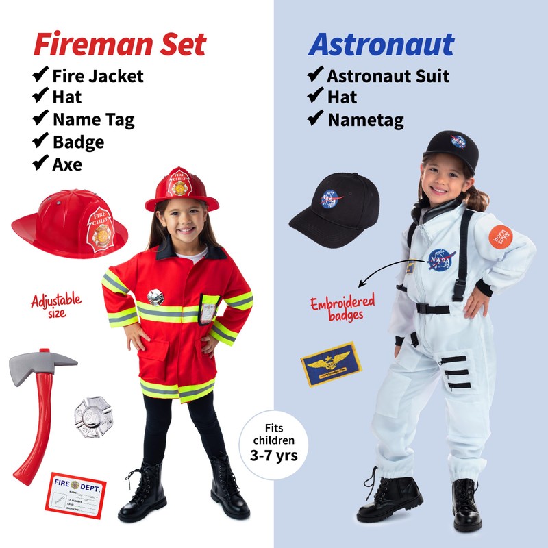 - EMPOWER GIRL POWER: This 4-in-1 set is all about celebrating girl power! Including both traditional feminine costumes and pro woman in the workplace. This career costumes promote ambitious young girls, enabling them to engage in a wide range of imaginative scenarios with friends of all ambitions. Wearing a diverse range of costumes lets her feel confident in expressing herself whether through heroic firefighter, adventurous astronaut, enchanting mermaid & magical unicorn
