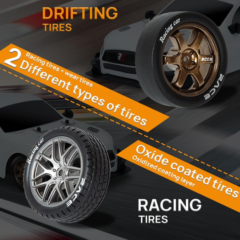 - Dual Tires Swap System: Master any terrain with 4 wear-resistant racing tyres and 4 soft drift tyres. With the included screwdriver, you can easily change the mode. Conquer rough tracks outdoors with the racing tyres or perform precision drifts with the drift tyres on smooth inner surfaces. Note: Using drift tires on rough surfaces will result in scratches which will reduce the life of the drift. We recommend racing tyres for rough surfaces.