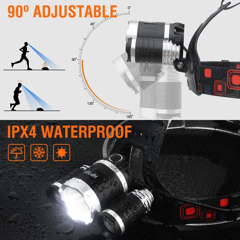 - ★90º Adjustable & Waterproof Headlight ➤➤90° adjustable runners headlamp allows you focus light on where you need it ,so you won't be tired when you with this headlamp.Much convenient and safer. IPX4 water resistant grade, it's safe to use even when it's raining,this headlamp will be your good camping stuff.