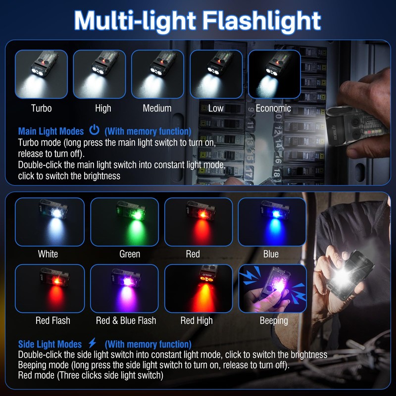 • Small Powerful Flashlight - Our V20 flat flashlight adopts( 2 white + 2 red)main light+COB colored side lights,brightness up to 1200 lumens,5 white light modes+1 red light modes for the main light,various colored light modes for the side lights (white/green/red/blue/red flash/red blue flashing)as well as a buzzer mode,suitable for your different lighting needs,ensuring powerful illumination in any situation.The wonderful gift for Dad
