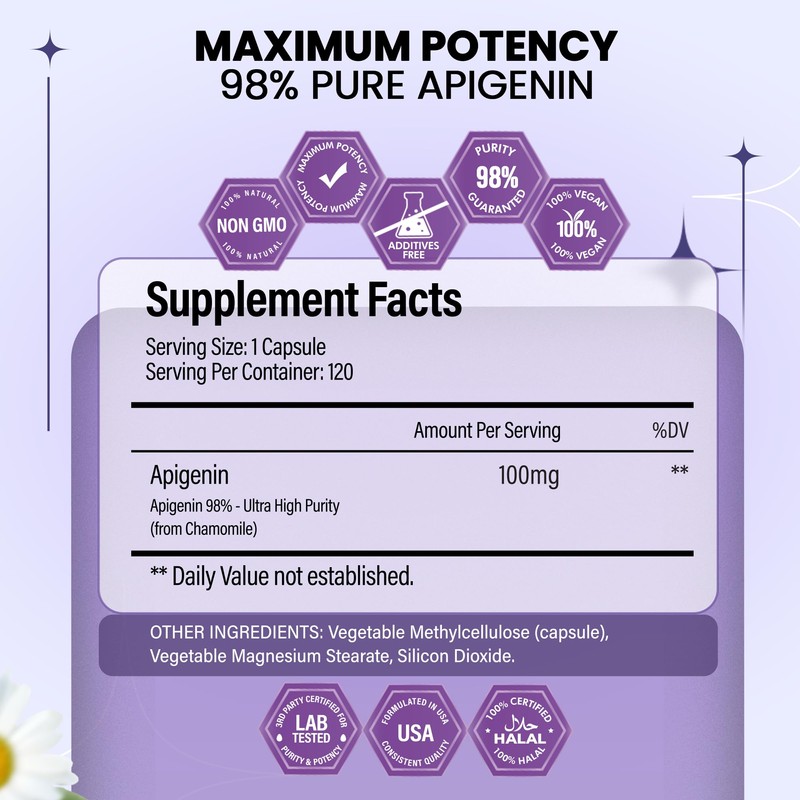 Apigenin Supplement 100mg from Chamomile Extract 120 Count - 98% purity- Apigenin Supplement for Sleep, Mood, Cognition, Prostate health - Excellent sleep aid, Non-GMO, No Fillers - 4-Month Supply