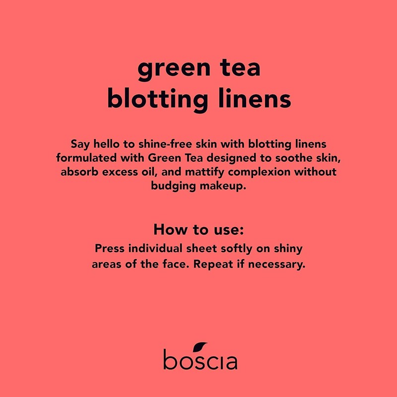 boscia Natural and Vegan Oil Absorbing Sheets for Face. Say hello to shine- free skin with purse-friendly blotting linens formulated with Green Tea designed to soothe skin, absorb excess oil, and mattify complexion without budging makeup. The oil removing face sheets are formulated with Green Tea Extract and Abaca Tree Fiber. Green Tea Extract has natural antibacterial benefits and is a key antioxidant that soothes and protects skin from free radical damage. boscia's Green Tea Blotting Linens can also be used to blot off excess lipstick to leave a stained lip look. FEATURES: Removes excess oil and mattifies complexion. Travel-Friendly. Made for all skin types. Natural botanical ingredients. INGREDIENTS SPOTLIGHT: 100% Natural Abaca Tree Fiber, Green Tea Extract. HOW TO USE: Press individual sheet softly on shiny areas of the face. Repeat if necessary. Perfect for blotting lipstick as well. PACKAGE INCLUDES: Green Tea Blotting Linens – 100 Sheets