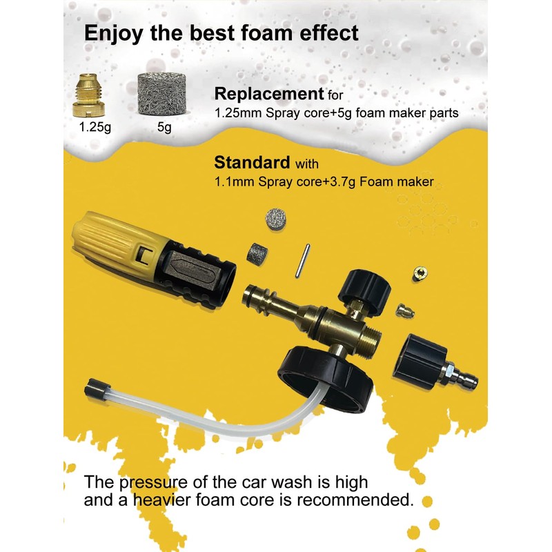 - Our Foam cannon come standard with 1.1mm Spray core+3.7g Foam maker. If you are not satisfied with the foaming result, you can replace the 1.25mm+5g foam maker parts(or 1.1mm+5g). Enjoy the best foam effect by your car wash machine!