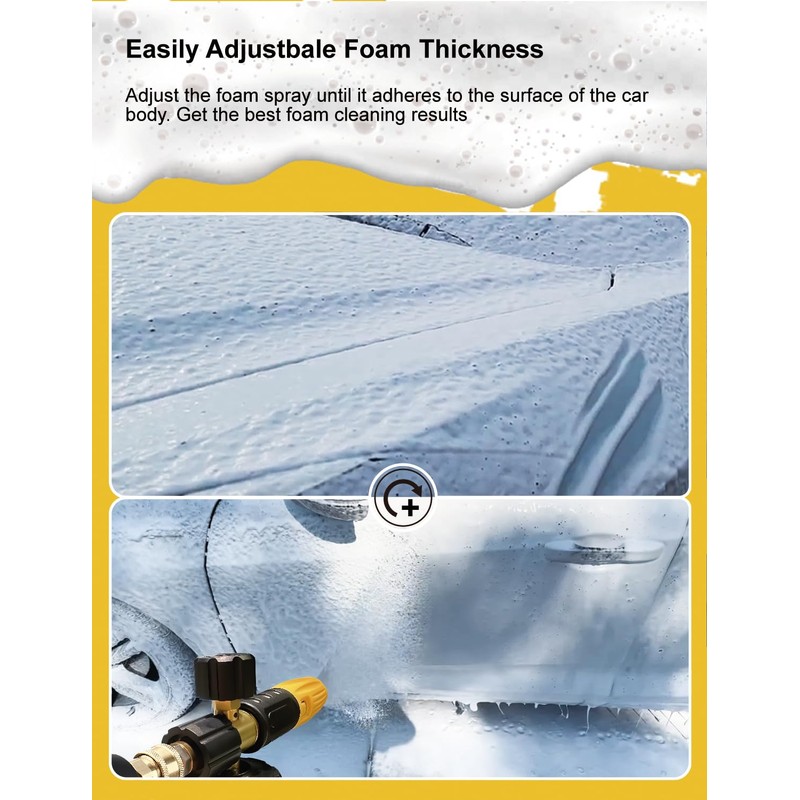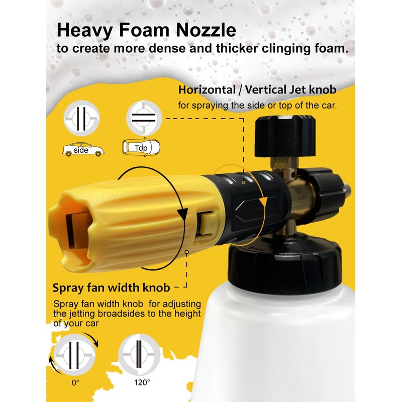 - Heavy Foam Nozzle. BOSEA foam cannon use thicker and heavier core for durable use and leak-free when use it. Heavy duty foam core make foam more dense and thick.