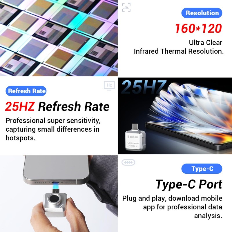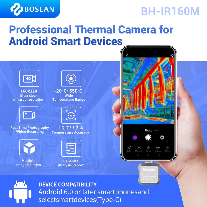 Bosean BH-IR160M Thermal Imaging Device for Android Smartphones, 160 x 120 IR Resolution Thermal Imaging Camera with 25Hz Update Rate, <40mK, -4℉~1022℉ Temperature Range