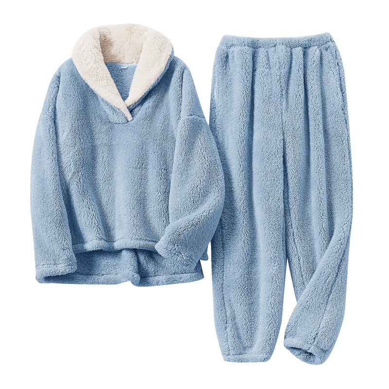 - 【Fuzzy fluffy loungewear set】These fleece lounge sets for women have a warm long fleece look with simple solid color, overall looks very comfortable and cute like a bunny. Turned out white collar and V-neckline design to this womens fleece pajamas set brings a rather novel accent.