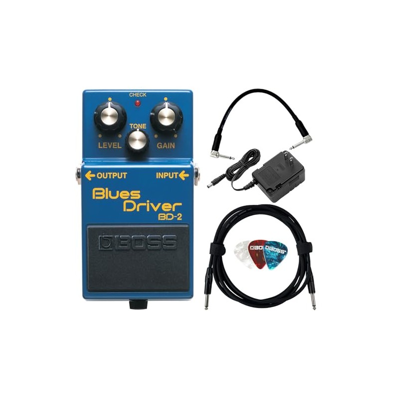 Boss BD-2 Blues Driver Bundle with Power Adapter, 10ft Instrument Cable, 6in Patch Cable, and Picks