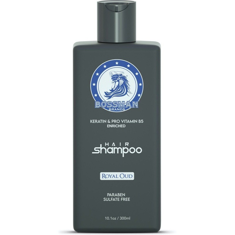 What are the benefits and features of Bossman Royal Oud Shampoo 300ml?- Cleanses and replenishes damaged hair.