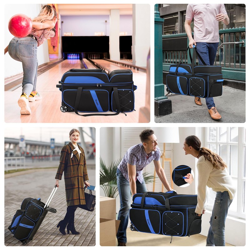 BOSSTIN 3 Ball Bowling Bags with Wheels, Secure Adhesive Fixed Ball Cup & Shoe Compartment (Fits Up to Size 16),Bowling Ball Bag 3 Ball Roller with Multi-Pockets (Blue)