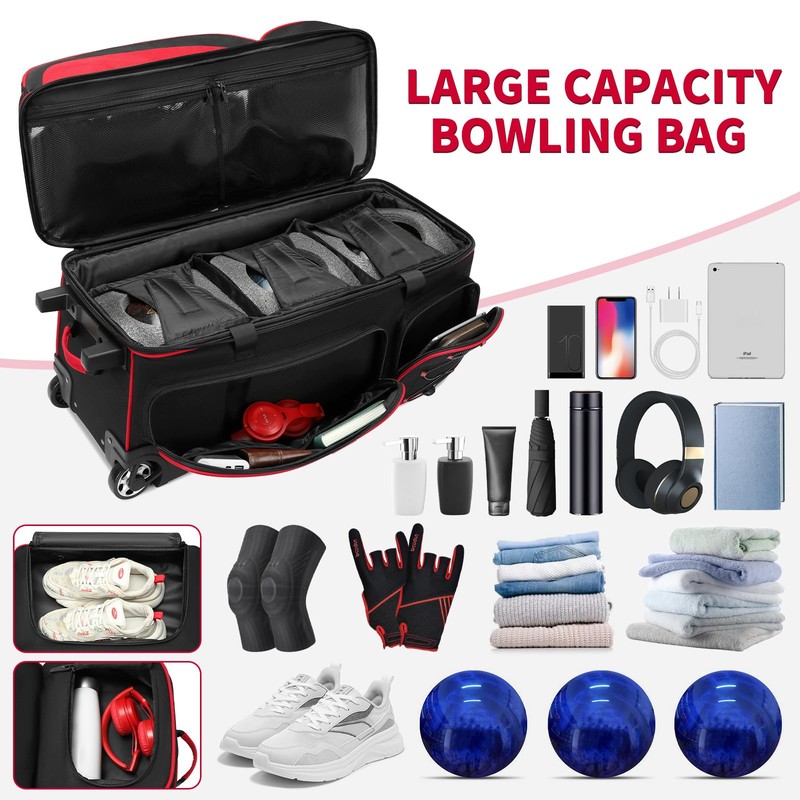 - 【Smooth Rolling】: Equipped with Quality Silent Wheels, this three ball bowling bag with wheels ensures effortless mobility and maneuverability,The triple bowling ball bag helps you to carry your bowling balls to anywhere easily ,3 ball bowling bag with three mesh pockets for better picking up and protecting your bowling ball。