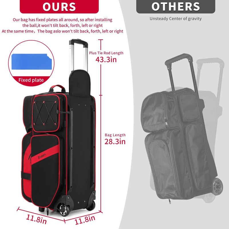 BOSSTIN 3 Ball Bowling Bags with Wheels, Bowling Ball Bag with Secure Velcro Fixed Ball Cup & Shoe Compartment (Fits Up to Size 16),Bowling Ball Bag 3 Ball Roller with Multi-Pockets (Red)
