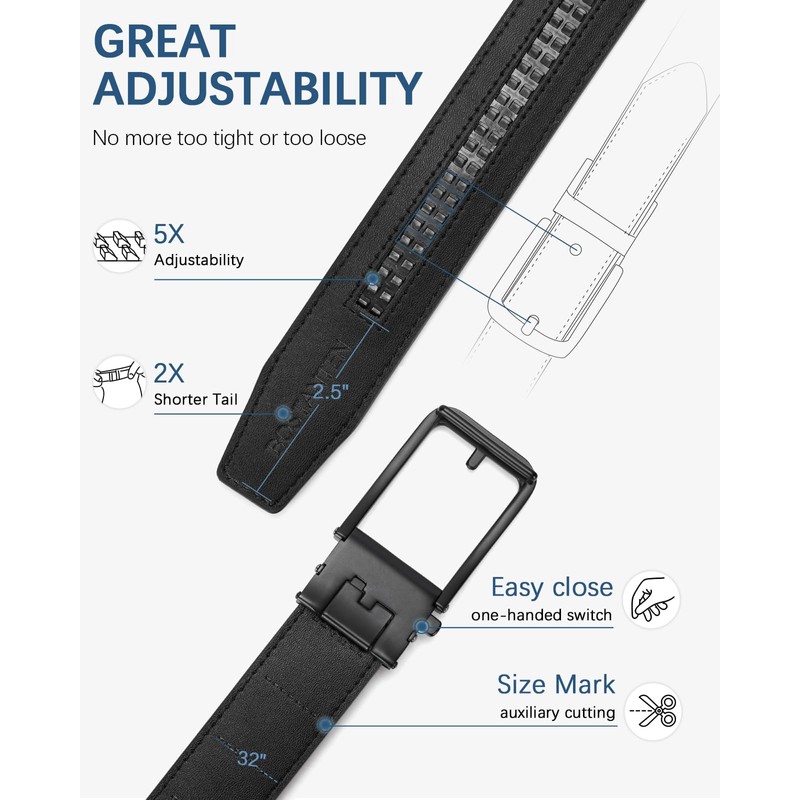 - El cinturón se puede ajustar fácilmente al ajuste exacto utilizando las muescas de carraca en la parte posterior, proporcionando un ajuste de tamaño micro de 0.25 pulgadas.