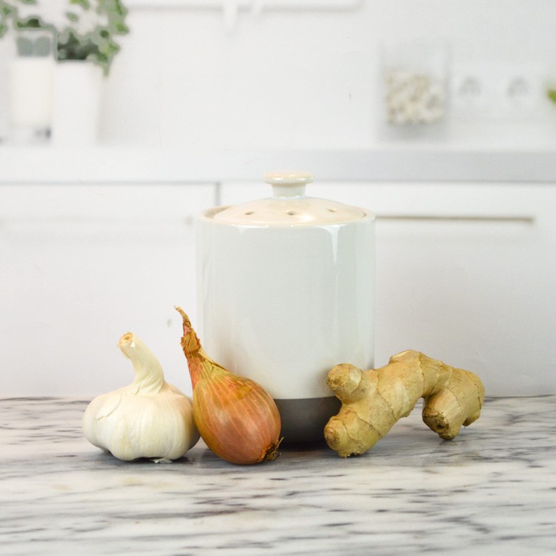 - Ventilado: troquelado con un dulce patrón floral, el recipiente ventilado permite que el aire circule, lo que evita la germinación, manteniendo tu ajo fresco durante más tiempo