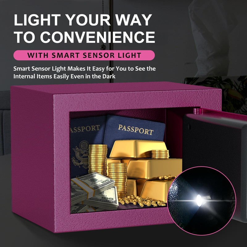 Bostra Fireproof Safe Box with Sensor Light & Fireproof Bag, Money Safe Box with Digital Keypad,Security Safe Box for Home, 0.23 Cubic Small Safe with Keys & Pass Code for Cash Jewelry Pink