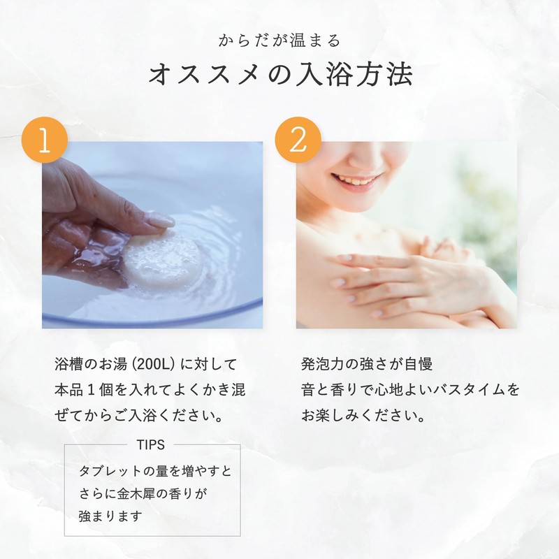 - Point 2: Moisturizing and squishy foam with moisturizing ingredients. Simply place the tablet in a bath. The smell of osmanus will spread and the moisturizing ingredient will moisturize your skin and start enjoying a pleasant bath time. With the scent of osmanthus osmanthus in addition to the foam and enjoy the healing time of the day, as well as the "Bicarbonate x Osmanus scent x moisturizing"
