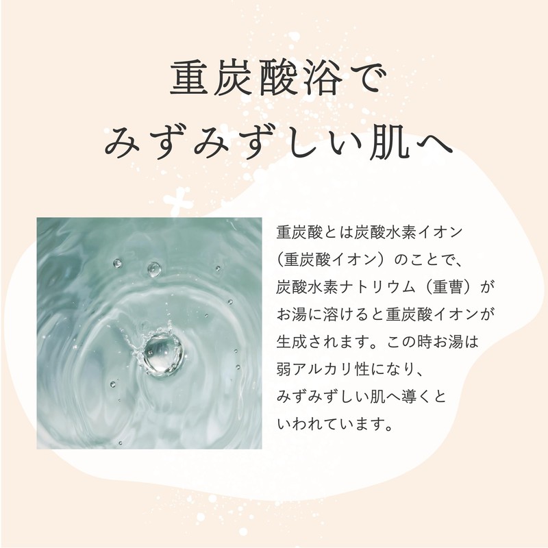 - Point 1, Bicarbonate Bath Fee x Osmanthus Scent from the popular Manisur series has released a foam bath tablet with an Osmanthus scent and organic ingredients. *Sodium carbonate (base material), citric acid (base material), sodium carbonate (base material), **cinnabara fruit (moisturizing), beet root (moisturizing), bicarbonate is a hydrogen ionic (bicarbonate ion), and when sodium hydrogen carbonate (baking soda) dissolves in hot water, it generates bicarbonate dium. It is said that hot water becomes weak alkaline and leads to fresher skin