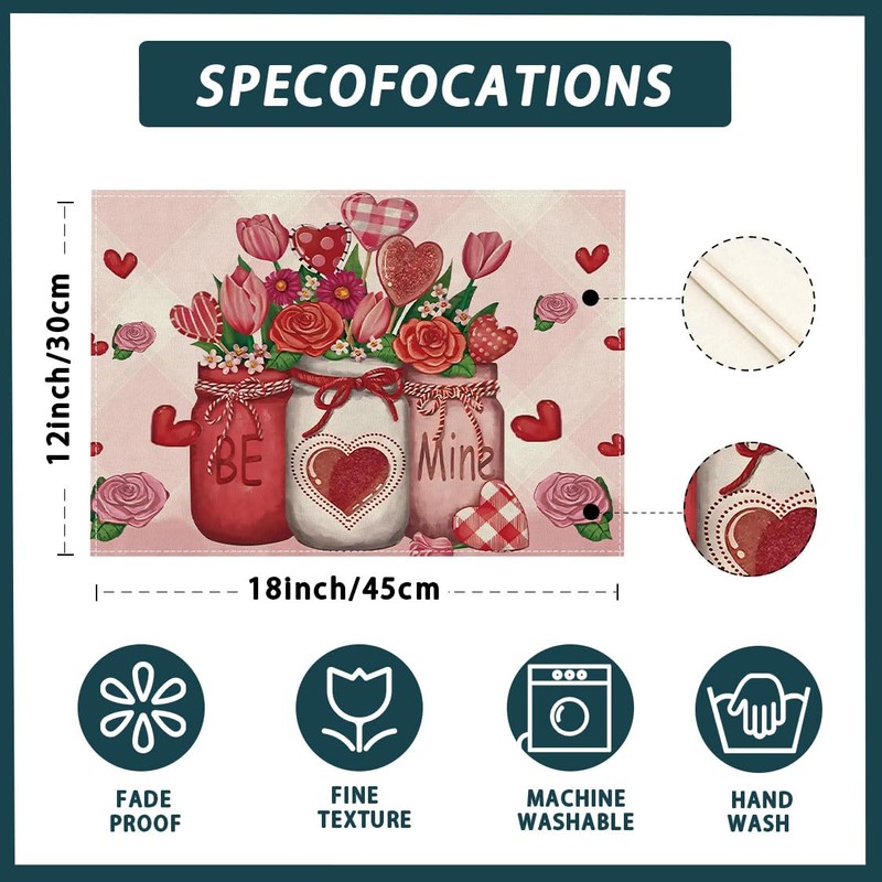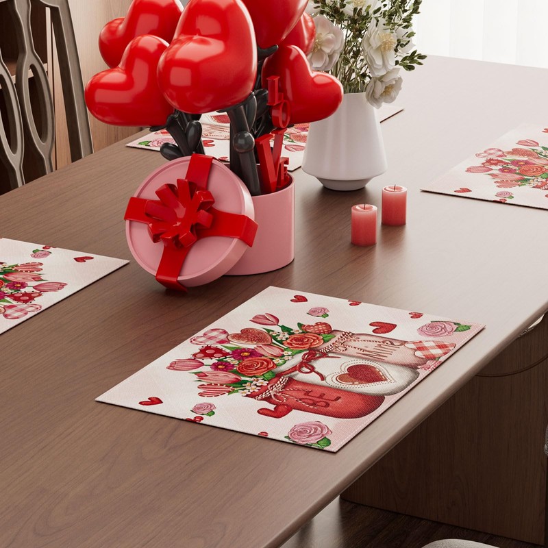 BOTB LIHM Valentines Day Roses Flowers Love Hearts Vase Cloth Placemats Set of 4 Table Mats Table Decorations 12x18 Inch
