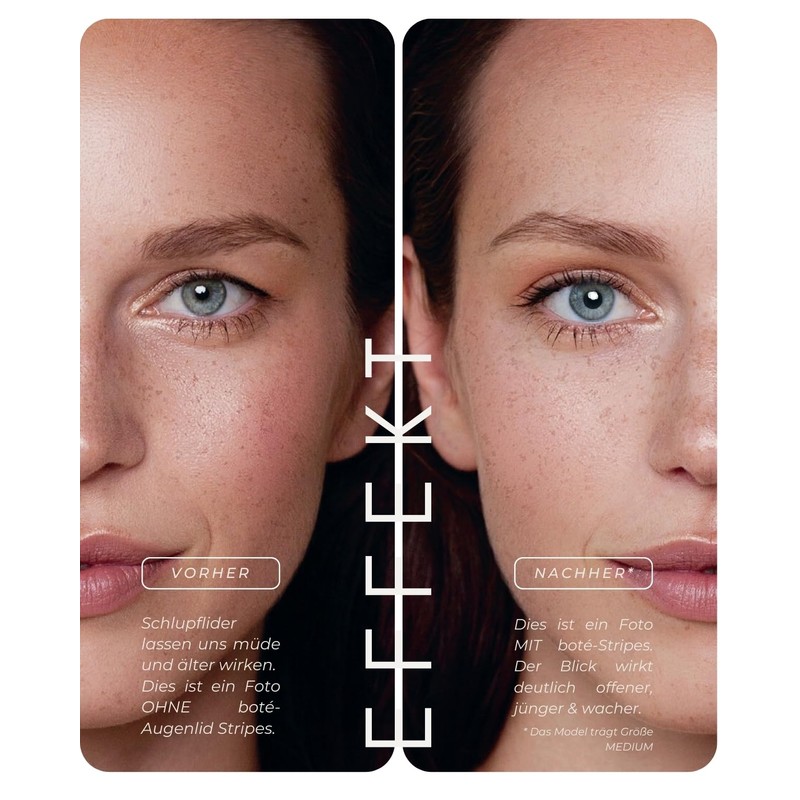 - Quick and easy – Convince yourself of the instant wow effect. Whether at home or on the go, with boté eyelid tightening strips you can easily conjure up your slip-on lids in just a few seconds.