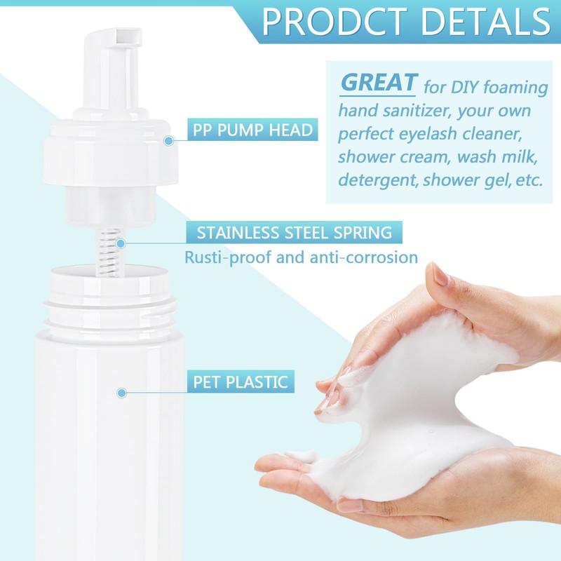 - Espuma rica: ideal para desinfectante de manos espumoso de bricolaje, tu propio limpiador de pestañas perfecto, crema de ducha, leche de lavado, detergente, champú, gel de ducha, etc. A través de la botella bomba de espuma, puedes obtener espuma rica. Para tener una experiencia de baño más cómoda.