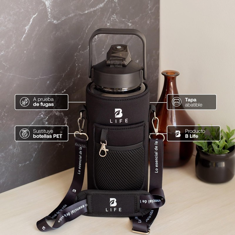 Botella de Agua de 2 litros con Funda Neopreno, con Popote y Asa, Fácil de transportar. Color Negro, Bebidas Duran Frías o Calientes más Tiempo sin Fugas. Botella Motivacional B Life.