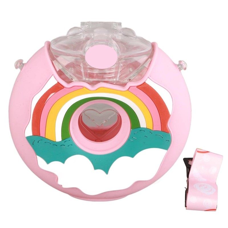 Botella de agua de dona de 380 ml con pajita para niños, sin BPA y a prueba de fugas con pajita, botella de bebida para niños pequeños. (Arcoíris rosa)