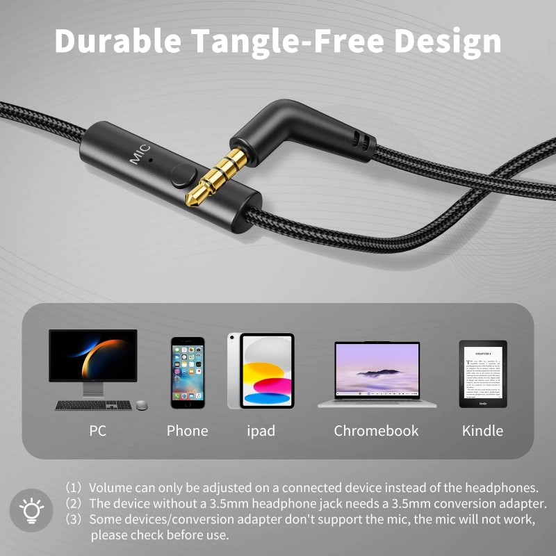 【PLEASE NOTE】(1)Volume can only be adjusted on a connected device instead of the headphones. (2)The device without a 3.5mm headphone jack needs a 3.5mm conversion adapter. (3)Some devices/conversion adapter don't support the mic, the mic will not work, please check before use.