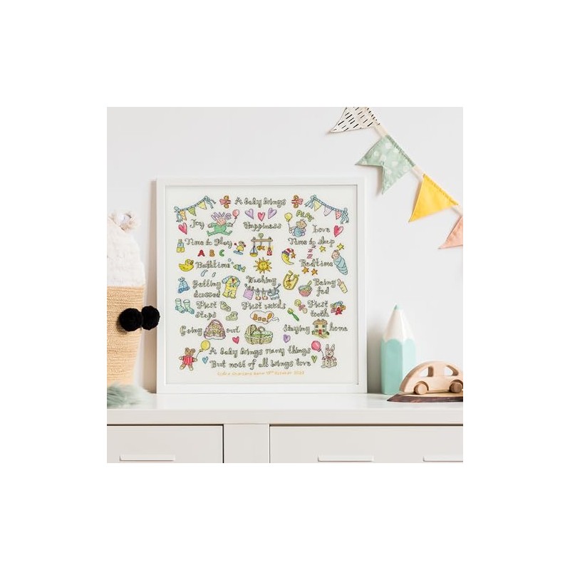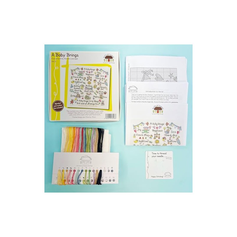 - The kit also includes a needle, an alpahbet and number line for personalising the design, and a clear stitch diagram and instructions