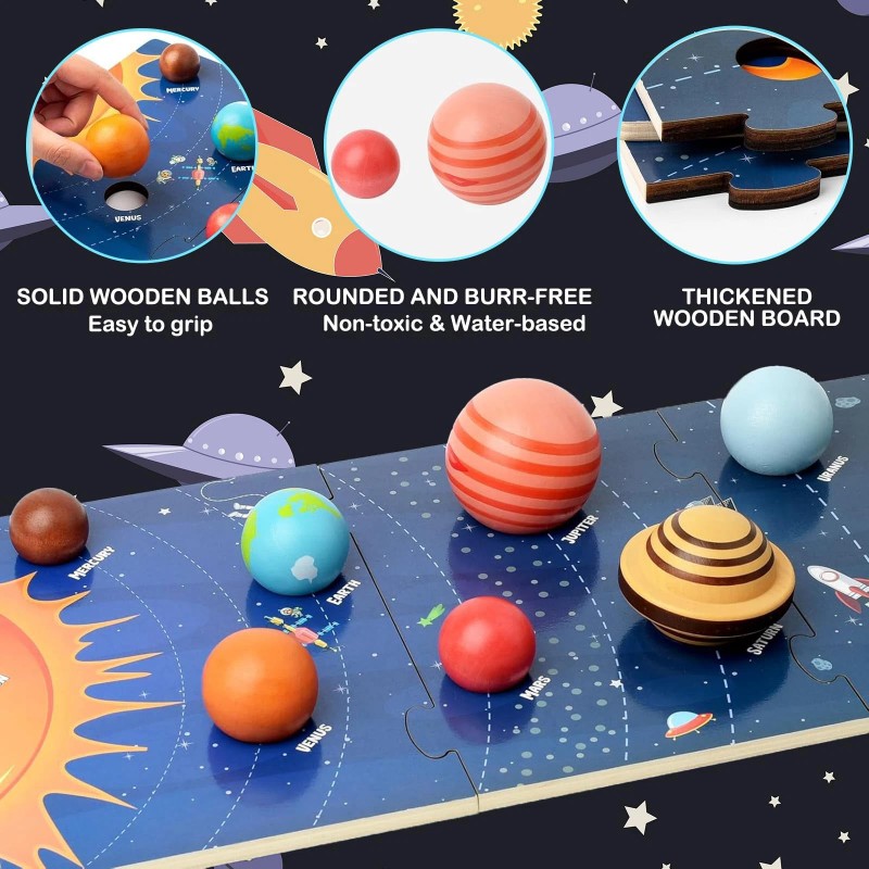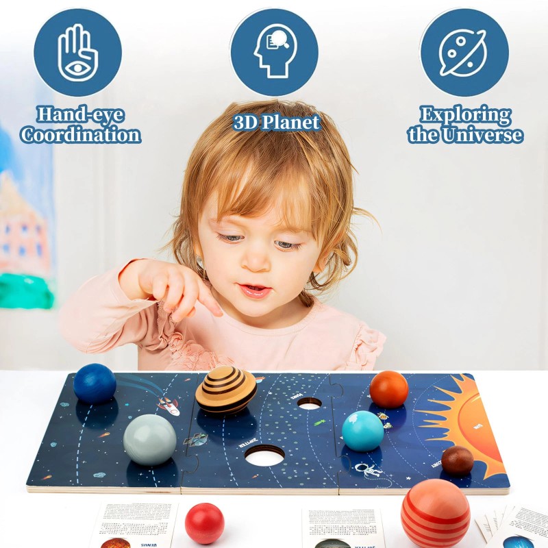 【Contents】: Includes eight planet-themed wooden balls, eight flashcards with detailed planet explanations, and three puzzles forming a cartoon solar system