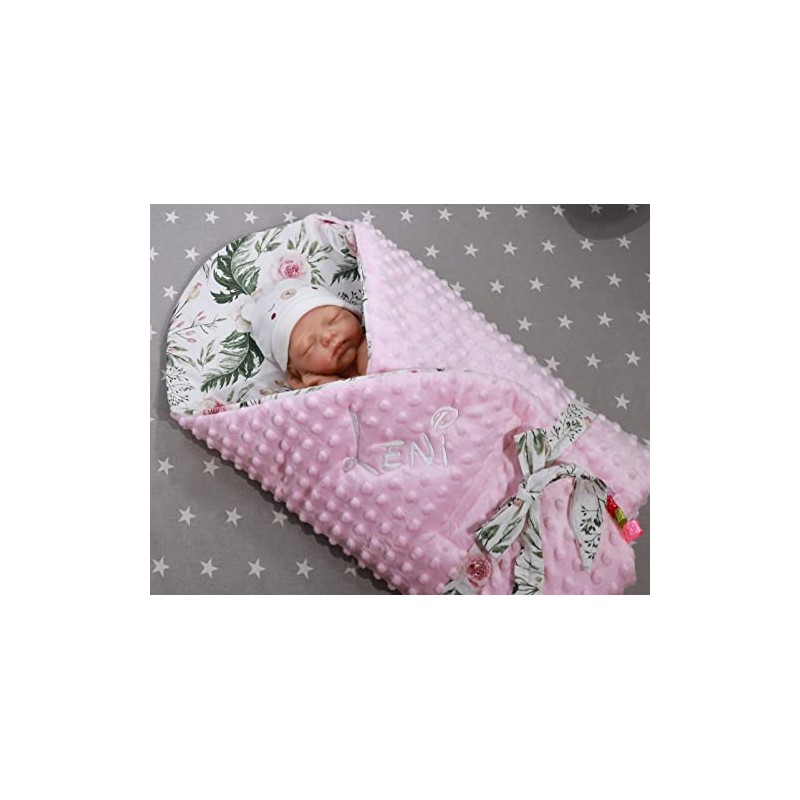 BotoBaby ★ Two-layer Swaddling Blanket Baby Blanket with Name and Date Embroidered ★ Minky Squirrel ★ Cotton ★ Filling ★ 75 x 75 cm ★ (Light Pink - Flowers)