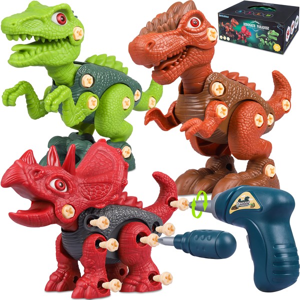 - Juguetes de dinosaurio: tres juguetes de dinosaurio que se pueden desmontar, incluyendo tiranosaurio, triceratops, velociraptor y accesorios de tornillo. Los dinosaurios coloridos atraen la atención de los niños y se ensamblan creativamente.