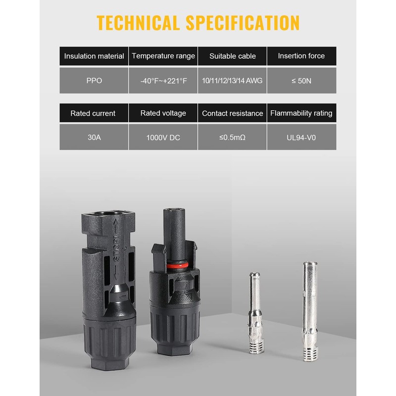 • Package Included: 6 pairs solar panel connectors Male & Female + 6 pairs solar connector pins (male & female) + 1 pair of spanners