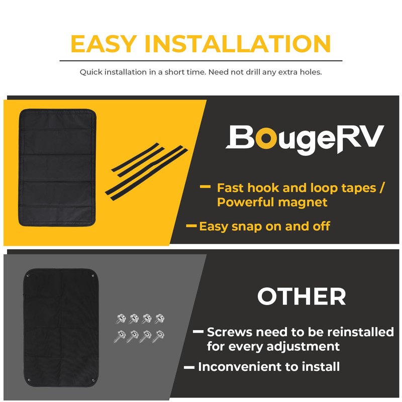 - Protect Privacy: BougeRV RV sun shade blackout is made of black thick Oxford materials. Excellent light-blocking performance, no light transmission at all.