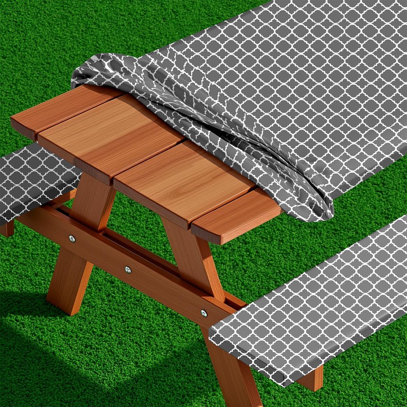 Bouiexye 3 Pcs Set Polyester Picnic Table Cover with Bench Covers, Elastic Outdoor Camping Tablecloth with Bag Backing Picnic Table Cloth Fits for Table 30"x 72" Rectangle(Gray White Morocco)