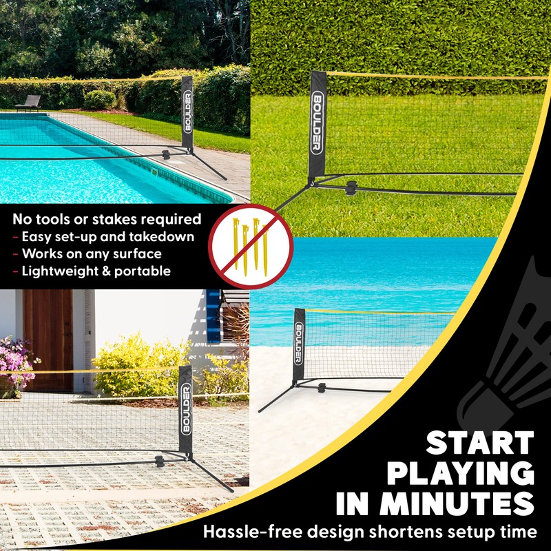 BOULDER Portable Badminton Pickleball Net - Foldable / Extendable Poles for Multiple Sports Heights (UP to 5 ft) - Ideal for Tennis, Pickleball, Soccer Tennis - Easy Setup (Black, 10 FT)