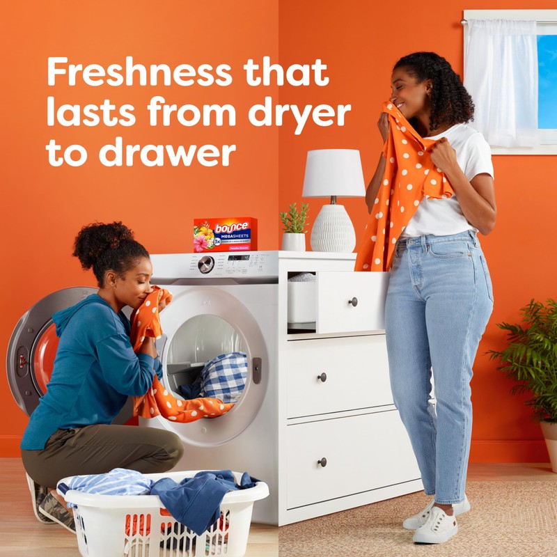One dryer sheet is all you need when you use Bounce Paradise Blossom Mega Dryer Sheets. With 5-in-1 benefits, including static control, wrinkle reduction, extra softness, lasting scent, and lint fighting, you get everything you want all from a single sheet. Bounce Mega Sheets equals the power of three regular sheets, meaning you use less every load. Just toss one and youre done! Get laundry that comes out less clingy with 3X more static-fighting ingredients compared to regular sheets.* Enjoy the scent of a paradise blossom that smells great from the dryer and lasts until you pull it from your drawer. Just toss it in the dryer to Bounce out wrinkles and static all while adding long lasting freshness and extra softness! *vs. Bounce Base dryer sheets