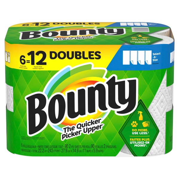 - Pack contains 6 Double Rolls of white Bounty Select-A-Size Paper Towels
