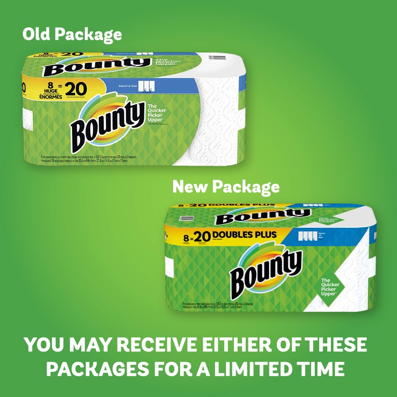 - Pack contains 8 Double plus rolls of Bounty White Select-A-Size paper Towels