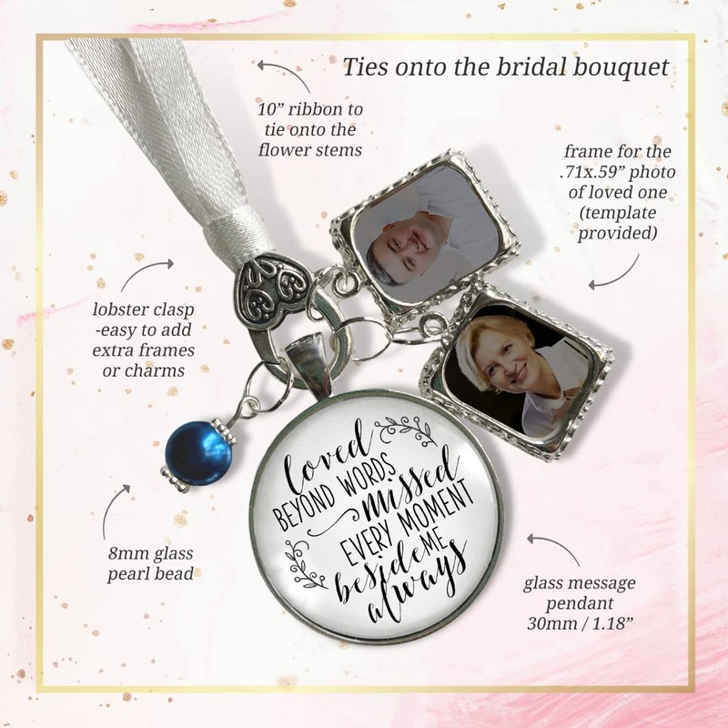 Bouquet Photo Charms For Wedding Memory Loved Beyond Words Missed Every Moment Honor Anyone 2 Picture Frames Antique Silvertone White Glass Pendant Something Blue Bead Bridal Remembrance DIY Template