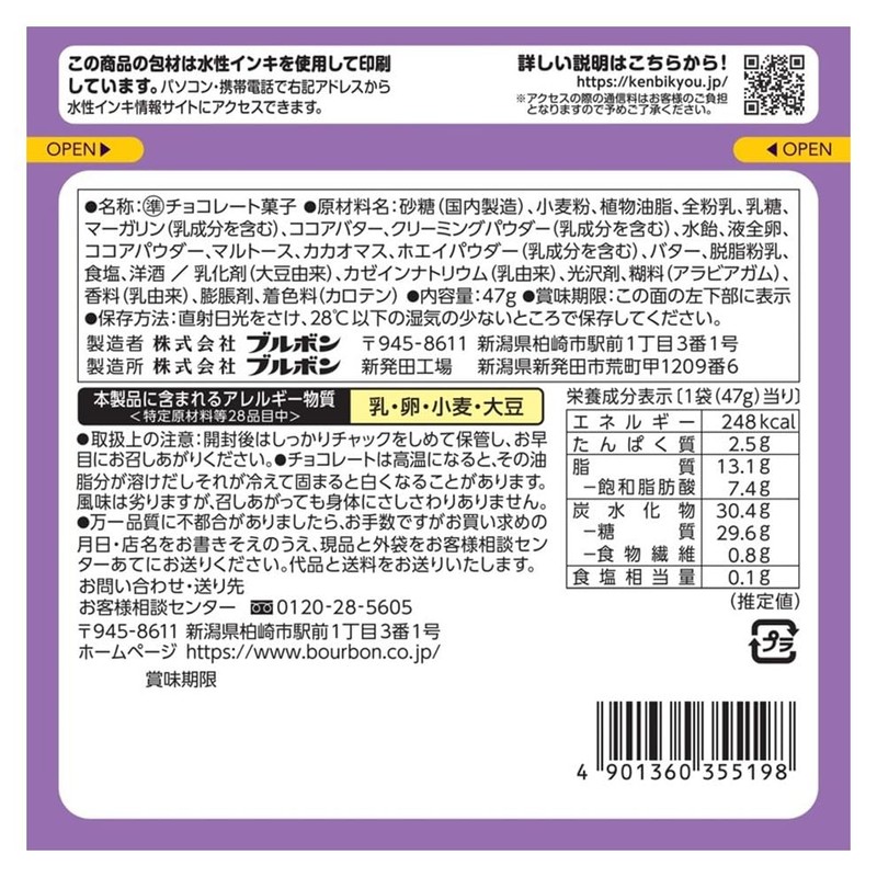 • Ingredients: Sugar (made in Japan), wheat flour, vegetable oil, whole milk powder, lactose, margarine (including milk ingredients), cocoa butter, creaming powder (including dairy components), sugar syrup, whole liquid eggs, cocoa powder, maltose, cacao mass, whey powder (including dairy ingredients), butter, skim milk powder, salt, seaweed sake. Gloss, Glue ( Arabic gum), fragrance (derived from milk), leavening agent, coloring (carotene)