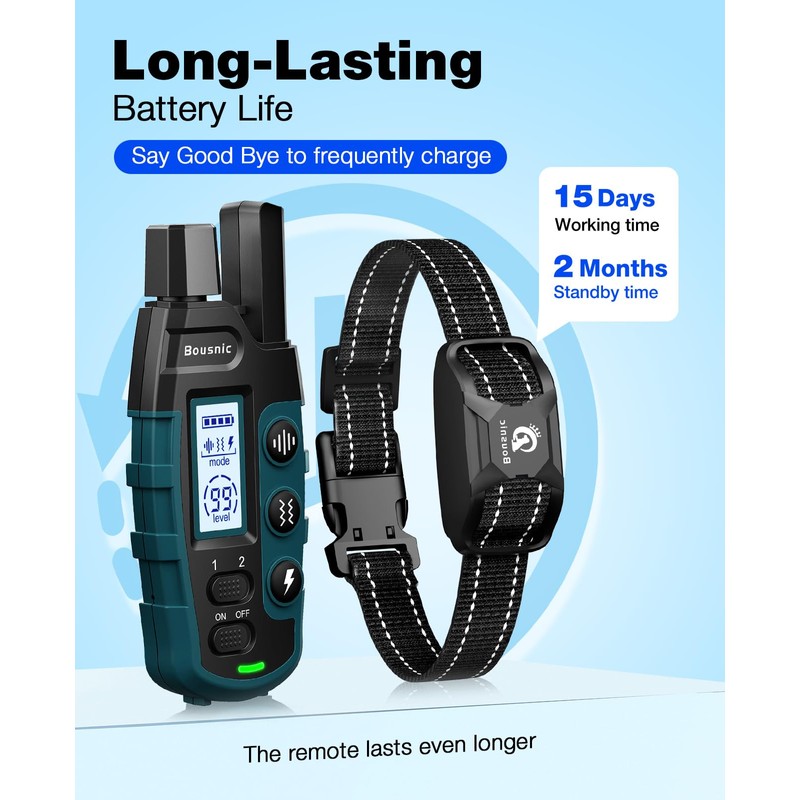 - Incredible Battery Life: The e collar for dogs training has a decent battery life. The receiver's battery can last for up to 15 days in working modes while the remote for over 1 month. the long battery runtime is a true lifesaver on those camping or tailgating weekends.
