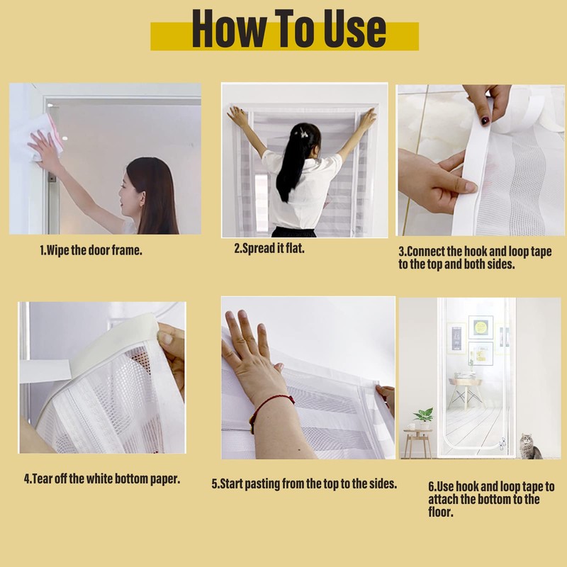 - Easy to Install and Remove: Just stick the glue on the back of the hook and loop to the door frame, then stick the pet door screen. Cat screen doors can be easily installed in minutes. It does not require any special tools or installation expertise. Clean door frame surfaces before installation to ensure a secure and durable fit.