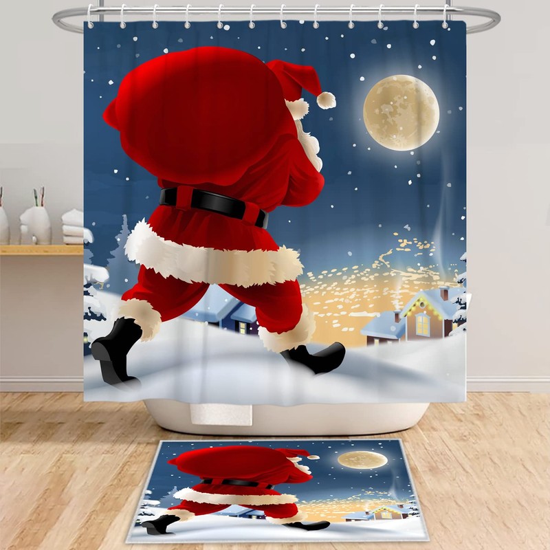 Bovlleetd 152 x 183 cm Santa Claus Shower Curtain Merry Christmas Shower Curtain Full Moon Stars Santa Claus Supplies Gifts Bathroom Art Curtain Waterproof Bath Curtain with Hooks