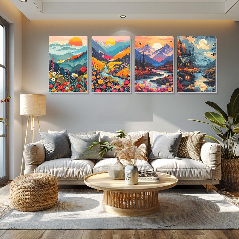 Bowetile 4 Pack Landscape Paint by Numbers Adult Kit Beginner, Adults Paint by Number Kits on Canvas with Frame, Mountain Peinture a Numero Adulte, DIY Acrylic Oil Painting Art Craft Kits, 8x12in