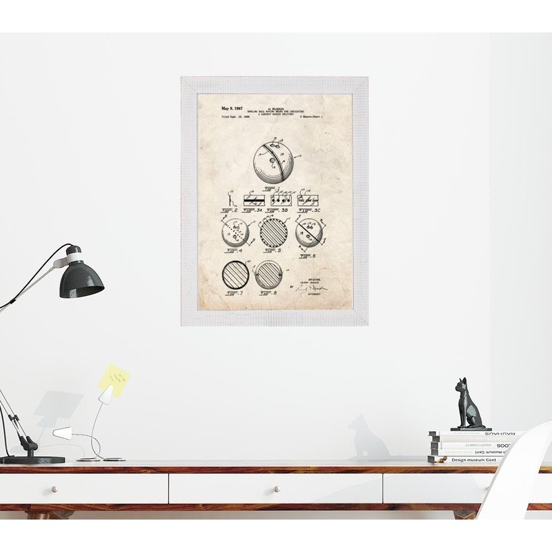 Bowling Ball Patent Art Old Look Print in a Distressed White Wood Frame (11" x 14") M12088