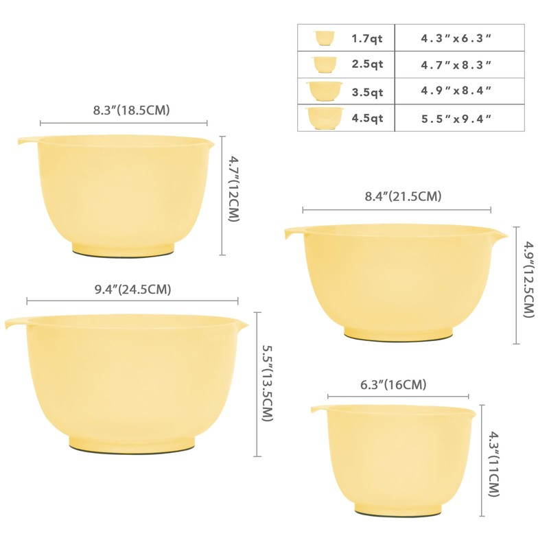 - 【Stackable Design & Space-Saving】4 piece nesting mixing bowls enhance ample capacity, sets includes 1.7qt bowl, 2.5qt bowl, 3.5qt bowl and 4.5qt bowl. This mixing bowl set with pour spout is tailored to meet your various needs from mixing to serving meal. And nesting design saves extra space to store more kitchen utensils or cookware.
