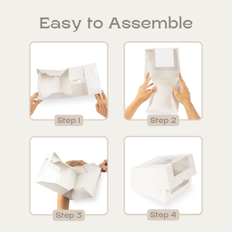- This package includes 10 bakery boxes with window, conveniently delivered flat for easy assembly by you. These white boxes are also perfect for small businesses which buy in bulk.